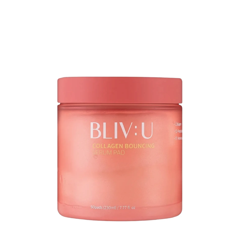 Discurile-toner rejuvenante BLIV:U Collagen Bouncing Serum Pad, cu concentrație ridicată, pe bază de colagen cu greutate moleculară mică și complex de peptide, sunt o alternativă tonerului și/sau esenței, dar cu funcții similare serului, adică cu o compoziție mai activă decât are tonerul obișnuit. Pad-urile înmoaie și netezesc micro-relieful, reduc intensitatea ridurilor și a porilor dilatați, cresc elasticitatea și densitatea pielii. Hidratează intens, calmează și reînnoiesc delicat pielea. Elimină uscăciunea și descuamarea, calmează, au un efect de întinerire, uniformizează tonul și conferă feței netezime și strălucire naturală. Discurile sunt fabricate din bumbac 100%, nu provoacă iritații și mâncărimi, sunt potrivite pentru pielea sensibilă.