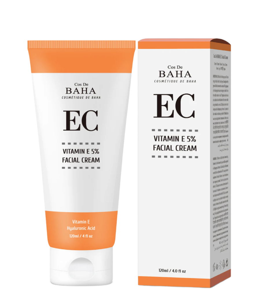 Crema regeneratoare Cos De BAHA EC Vitamin E Facial Cream pe bază de 5% vitamina E și ceramide hidratează, hrănește și catifelează pielea, exercită o acțiune antioxidantă puternică, restabilește și păstrează bariera de protecție, scade sensibilitatea și elimină starea de uscăciune, strângere și deshidratare.