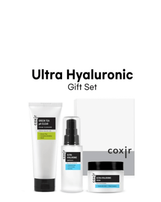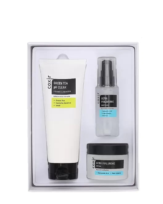 Setul Coxir Ultra Hyaluronic Gift Set include 3 produse: spumă de curățare pentru față, ser și cremă. Acțiunea produselor vizează hidratarea și tonifierea pielii.