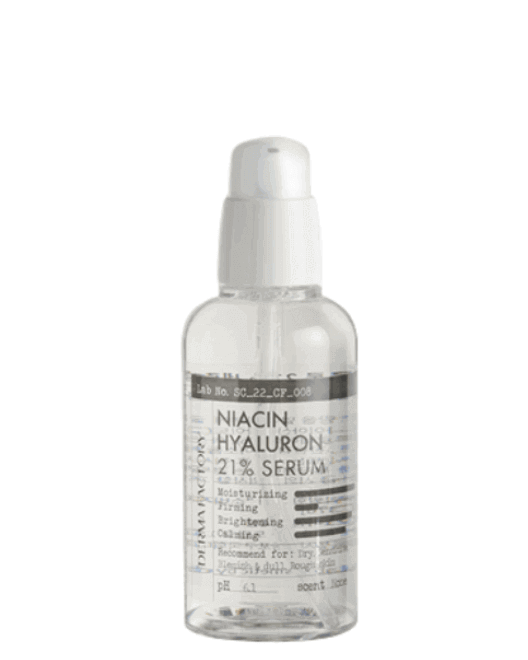 Derma Factory Niacin Hyaluron 21% Serum este un ser cu acid hialuronic și niacinamidă, care este potrivit pentru toate tipurile de piele. Produsul restabilește echilibrul apei, are efect antioxidant și de întinerire, netezește ridurile fine, stimulează sinteza de colagen în piele, uniformizează tonusul, întărește vasele dilatate, oferind un efect anti-cuperoză, conferă pielii prospețime și strălucire. Produsul are efect calmant, elimină roșeața și iritația, reduce nivelul inflamației. Serul se absoarbe instantaneu, îmbunătățește efectul altor produse de îngrijire ale pielii și nu lasă în urmă disconfort sub formă de aspect lipicios sau uleios.