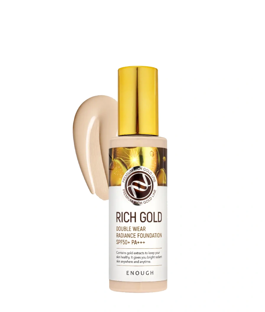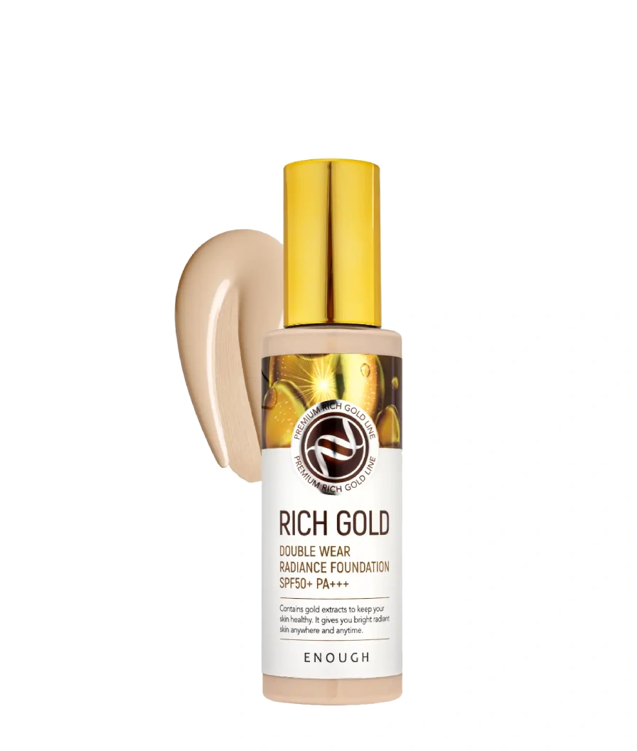 Fondul de ten SPF50+++ cu Enough Premium Rich Gold Double Wear Radiance Foundation SPF 50 PA+++ creează o acoperire impecabilă fără efect de „mască”, ascunde imperfecțiunile, nu lasă urme, oferă o strălucire naturală pielii, hidratează, ajută la întinerirea și eliminarea iritațiilor.