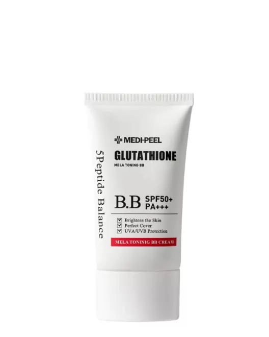 Crema-BB cu glutation MEDIPEEL Bio-Intense Glutathione Mela Toning BB Cream SPF 50+ PA++++ pe bază de filtre solare combinate funcționează în trei moduri: ascunde imperfecțiunile și îmbunătățește textura pielii, întinerește, iluminează și previne pigmentarea, precum și oferă protecție suplimentară împotriva efectelor negative ale soarelui.