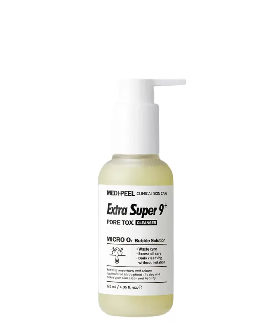 Gelul-spumă cu oxigen pentru curățarea zilnică în profunzime a porilor de impurități și sebum MEDIPEEL Extra Super 9+ Pore Tox Cleanser pătrunde adânc în pori, îndepărtează toate tipurile de impurități, îndepărtează machiajul obișnuit și de lungă durată, fondul de ten și protecția solară.