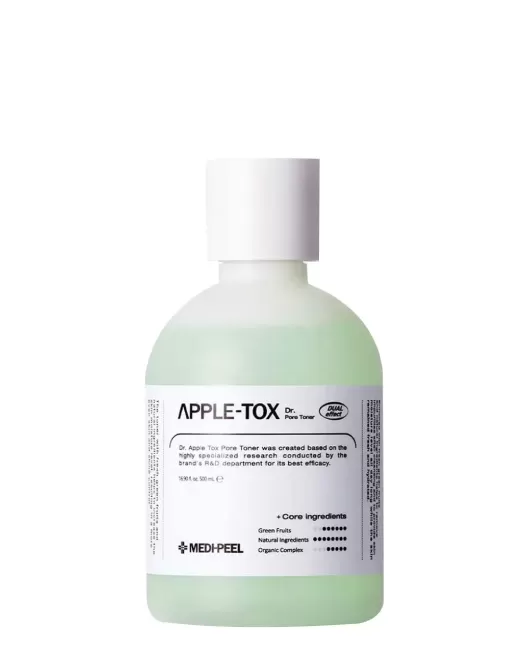 Tonerul regenerator pentru față de la MEDIPEEL Apple-Tox Dr. Pore Toner, bazat pe complexul Oriental Beauty Fruits Newplex (OBFN) de mandarine și mere necoapte, conține de 32 de ori mai mulți polifenoli decât fructele complet coapte.