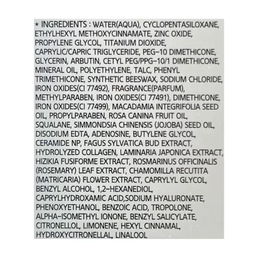 Water (Aqua), Ethylhexyl Methoxycinnamate, Zinc Oxide, Propylene Glycol, Titanium Dioxide (CI 77891), Caprylic/Capric Triglyceride, PEG-10 Dimethicone, Iron Oxides (CI 77492), Glycerin , Cetyl PEG/PPG-10/1 Dimethicone, Arbutin, Mineral Oil, Polyethylene, Talc, Phenyl Trimethicone, Beeswax (Cera Alba), Sodium Chloride, Iron Oxides (CI 77491), Methylparaben, Iron Oxides (CI 77499), Dimethicone, Propylparaben, Rosa Canina Fruit Oil, Squalane, Macadamia Ternifolia Seed Oil, Simmondsia Chinensis (Jojoba) Seed Oil, Disodium EDTA, Adenosine, Butylene Glycol, Ceramide NP, Fagus Sylvatica Bud Extract, Hydrolyzed Collagen, Chamomilla Recutita (Matricaria) Flower Extract, Hizikia Fusiforme Extract, Laminaria Japonica Extract, Rosmarinus Officinalis (Rosemary) Leaf Extract, Caprylyl Glycol, Benzyl Alcohol, 1,2-Hexanediol, Caprylhydroxamic Acid, Sodium Hyaluronate, Phenoxyethanol, Benzoic Acid, Tropolone, Fragrance (Parfum), Alpha-Isomethyl Ionone, Benzyl Salicylate, Citronellol, Limonene, Hexyl Cinnamal, Hydroxycitronellal, Linalool.