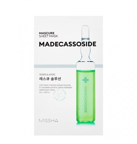 Masca calmantă din țesătură Missha Mascure Madecassoside Sheet Mask cu un extract activ din centella-madecassoside hidratează, hrănește și calmează pielea, activează producția de colagen și elastină. Masca îmbunătățește textura pielii, restabilește bariera pielii deteriorate, combate roșeața și erupțiile cutanate, promovează regenerarea dermului, uniformizează nuanța pielii.