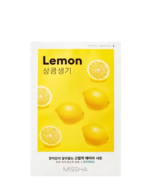 Masca iluminatoare din țesătură Missha Airy Fit Sheet Mask Lemon pe bază de extract de lămâie tonifică eficient pielea, îngustă porii, îmbunătățește tenul, elimină ternitatea și semnele de oboseală, iluminează delicat pigmentarea și post-acneea, are efect antioxidant, promovează regenerarea și recuperarea, are efect de întărire a vaselor de sânge.