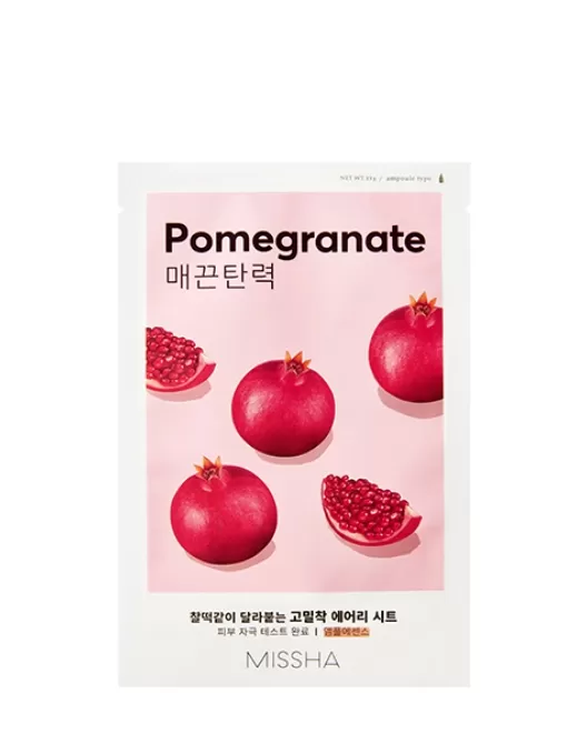 Masca regenerantă din țesătură pentru față Missha Airy Fit Sheet Mask Pomegranate pe bază de rodie hrănește și hidratează intens pielea, are efect întineritor și antioxidant, uniformizează tenul, netezește și catifelează pielea. Masca elimină tenul tern și urmele de oboseală, reface și regenerează pielea, calmează și oferă hidratare pe termen lung.