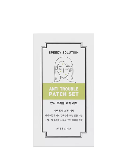 Patch-urile antiinflamatoare pentru aplicare locală Missha Speedy Solution Anti-Trouble Patch Set îndeplinesc mai multe funcții: protejează pielea inflamată de influențele externe negative și de traume accidentale, maschează, calmează inflamația, accelerează vindecarea acesteia și previne apariția post-acneei. Patch-urile pentru aplicare locală aderă cu ușurință la zona de inflamație, reduc roșeața și accelerează efectul antiinflamator și antibacterian.