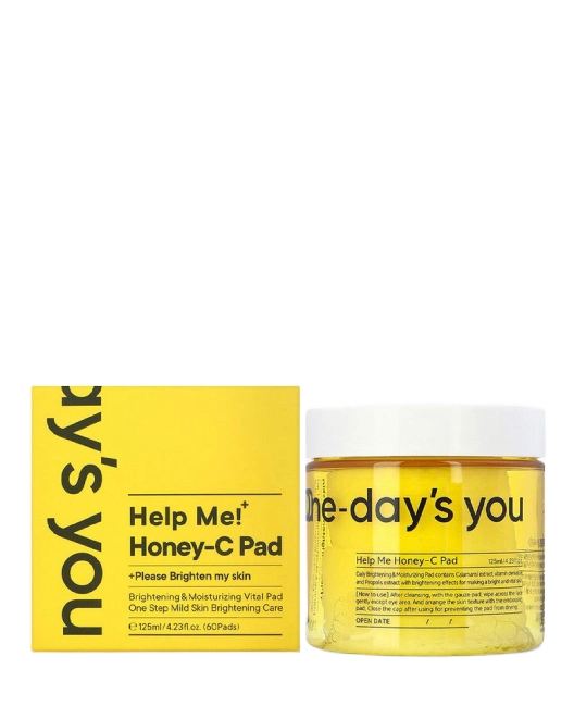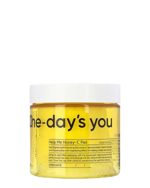 Discurile-toner hipoalergenice și iluminatoare One-days you Help Me! Honey-C Pads uniformizează tonul pielii, iluminează pielea și elimină tenul tern sau plictisitor. Acestea hidratează intens, au efect antioxidant și hrănitor, revitalizează și regenerează, ajută la îngustarea porilor și la eliminarea excesului de grăsime. Discurile netezesc pielea, calmează iritațiile și reduc inflamațiile, au un efect întineritor, răcoritor și tonifiant. Acest format de produs este deosebit de convenabil pentru călătorii și deplasări. Pad-urile nu conțin coloranți sau parfumuri sintetice, au un miros și o culoare naturală, datorită conținutului de extracte de plante. Poate fi folosit ca mască topică.