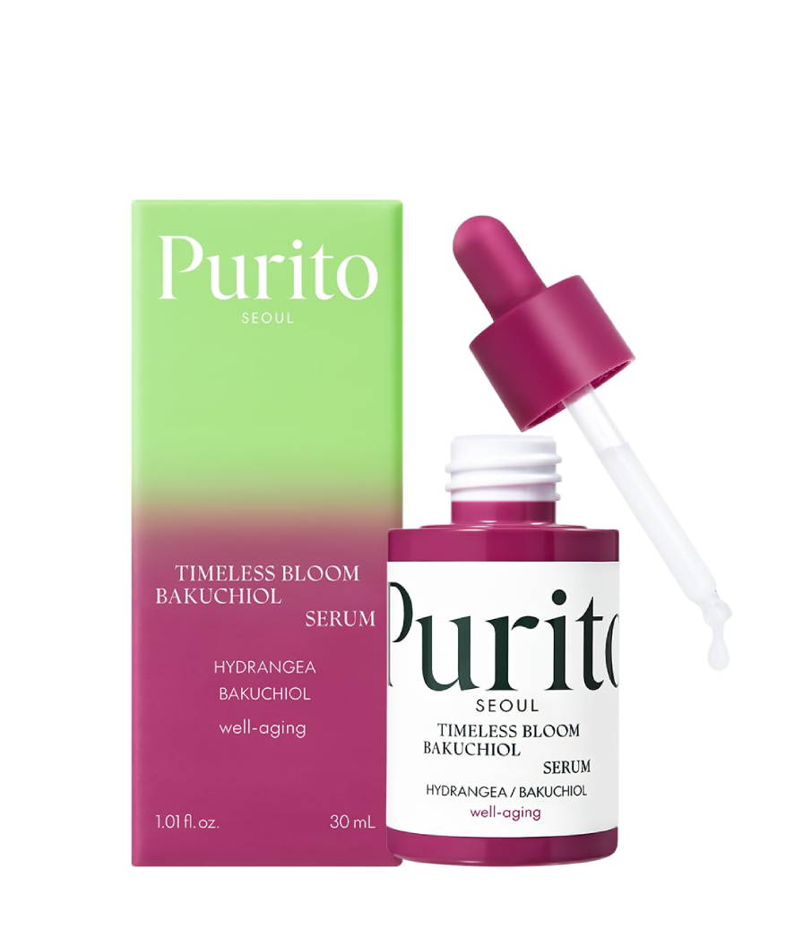 Purito SEOUL Bakuchiol Timeless Bloom Revitalizing Serum este un ser cu absorbție rapidă, cu 1% Bakuchiol, pentru a combate semnele timpurii ale îmbătrânirii. Potrivit pentru toate tipurile de piele, serul hidratează și calmează, oferind în același timp un efect de întinerire. Produsul stimulează reînnoirea celulară, iluminează delicat și uniformizează nuanța pielii, netezește ridurile fine și face cutele mari mai puțin vizibile. Serul elimină tenul tern, conferă prospețime, reduce inflamația și iritația, îmbunătățește elasticitatea și fermitatea pielii, îmbunătățindu-i textura, ceea ce a fost dovedit clinic.
