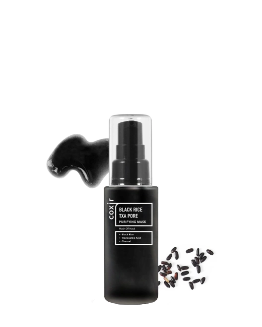 Увлажняющая, смываемая маска для очищения кожи и глубокого очищения пор Coxir Black Rice TXA Pore Purifying Mask на основе черного риса и транексамовой кислоты обладает осветляющим эффектом, выравнивает тон кожи, устраняет тусклый или землистый цвет лица, глубоко очищает поры, не пересушивая кожу. Маска устраняет излишки кожного сала, черные точки, ороговевший слой кожи, обеспечивая глубокое очищение без нарушения защитного барьера кожи. Увлажняет и смягчает, тонизирует, повышает эластичность. Маска максимальна удобна в применении: легко смывается и благодаря высокоактивной формуле время действия маски 1-2 минуты.