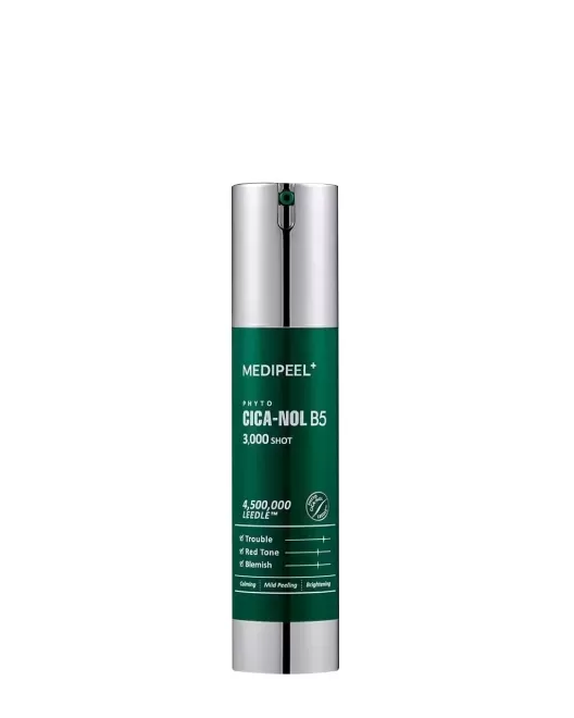 Обновляющая сыворотка MEDIPEEL Phyto Cica-Nol B5 3000 Shot Serum с увлажняющим и успокаивающим эффектом обеспечивает деликатное обновление кожи, разглаживает текстуру, выравнивает тон, оказывает продолжительное увлажняющее, антисептическое и мощное успокаивающее действие, смягчает шелушащиеся и огрубевшие участки. Сыворотка предотвращает появление черных точек и закрытых комедонов, снижает уровень воспалений и раздражений, уменьшает выраженность пигментации и возрастных изменений, придает коже здоровое сияние, устраняет тусклый цвет лица, оказывая детокс-действие. Регулирует жирность кожи, способствует сужению пор и устранению постакне. Обладает омолаживающим, разглаживающим и общим оздоравливающим действием на кожу. Содержит особую технологию Phyto Cica-Nol Leedle™, которая состоит из спикул (микроигл органического происхождения – структурных элементов тел пресноводных губок, которые растворяются в коже), скомбинированных с экстрактом центеллы. Такая технология позволяет средству работать максимально эффективно и транспортировать экстракт центеллы глубоко в кожу, повышая эффективность продукта. Средство может вызывать ощущения легкого покалывания или покраснение при использовании за счёт воздействия спикул на кожу.