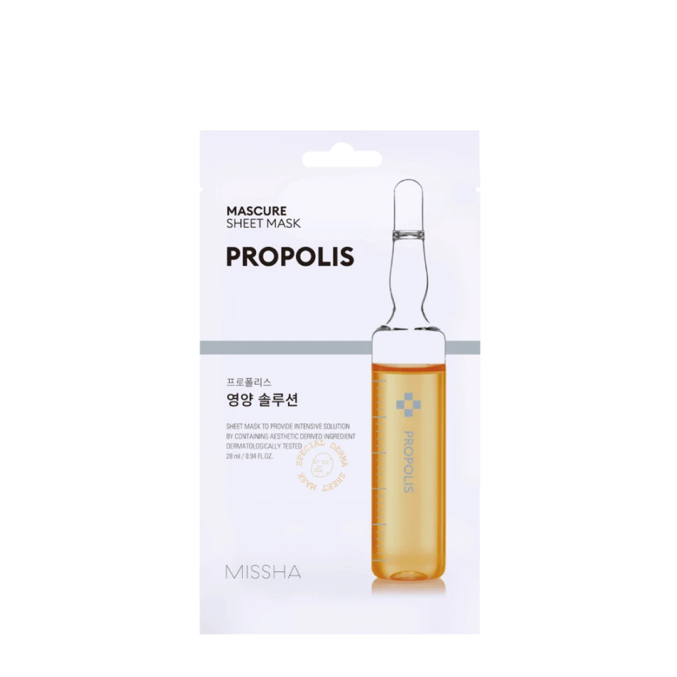 Питательная тканевая маска Missha Mascure Propolis Sheet Mask на основе прополиса интенсивно насыщает кожу витаминами и микроэлементами, оказывает питательное и сильное восстанавливающее действие, успокаивает, придает сияние коже и выравнивает тон, повышает эластичность и упругость.