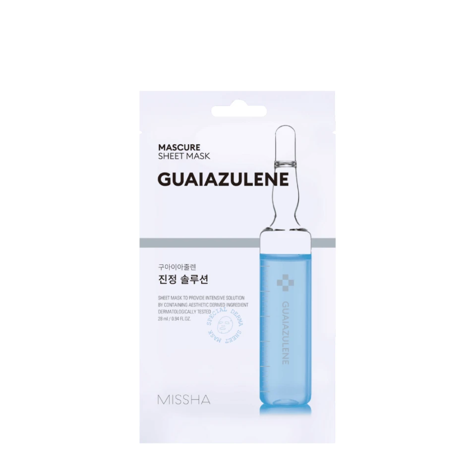 Успокаивающая тканевая маска Missha Mascure Calming Solution Guaiazulene Sheet Mask на основе гвайазулена - аналог основного действующего вещества ромашки, оказывает интенсивный успокаивающий и противовоспалительный эффект.