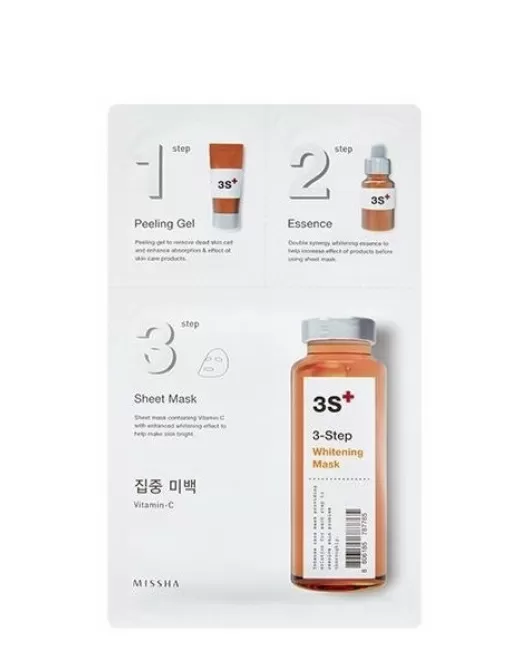 Инновационная осветляющая маска для лица Missha 3 Step Whitening Mask обеспечивает комплексный уход за кожей и включает в себя пилинг-гель, эссенцию и тканевую маску. Средство выравнивает тон кожи, способствует отшелушиванию ороговевшего слоя и осветлению пигментации и постакне, увлажняет кожу, оказывает тонизирующий, восстанавливающий и освежающий эффект, повышает упругость и эластичность. Улучшает текстуру кожи, устраняет тусклый цвет лица и придает сияние.