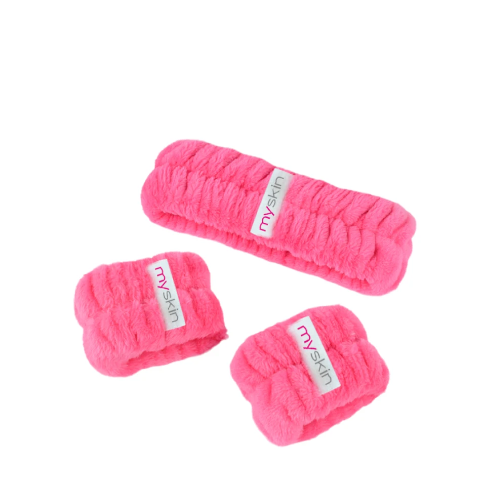 Набор для умывания в розовом оттенке от My Skin включает в себя повязку на голову и нарукавники. Мягкая повязка на голову надёжно фиксирует волосы и подходит для любого объёма волос и головы – благодаря удобной резинке и эластичному материалу.
