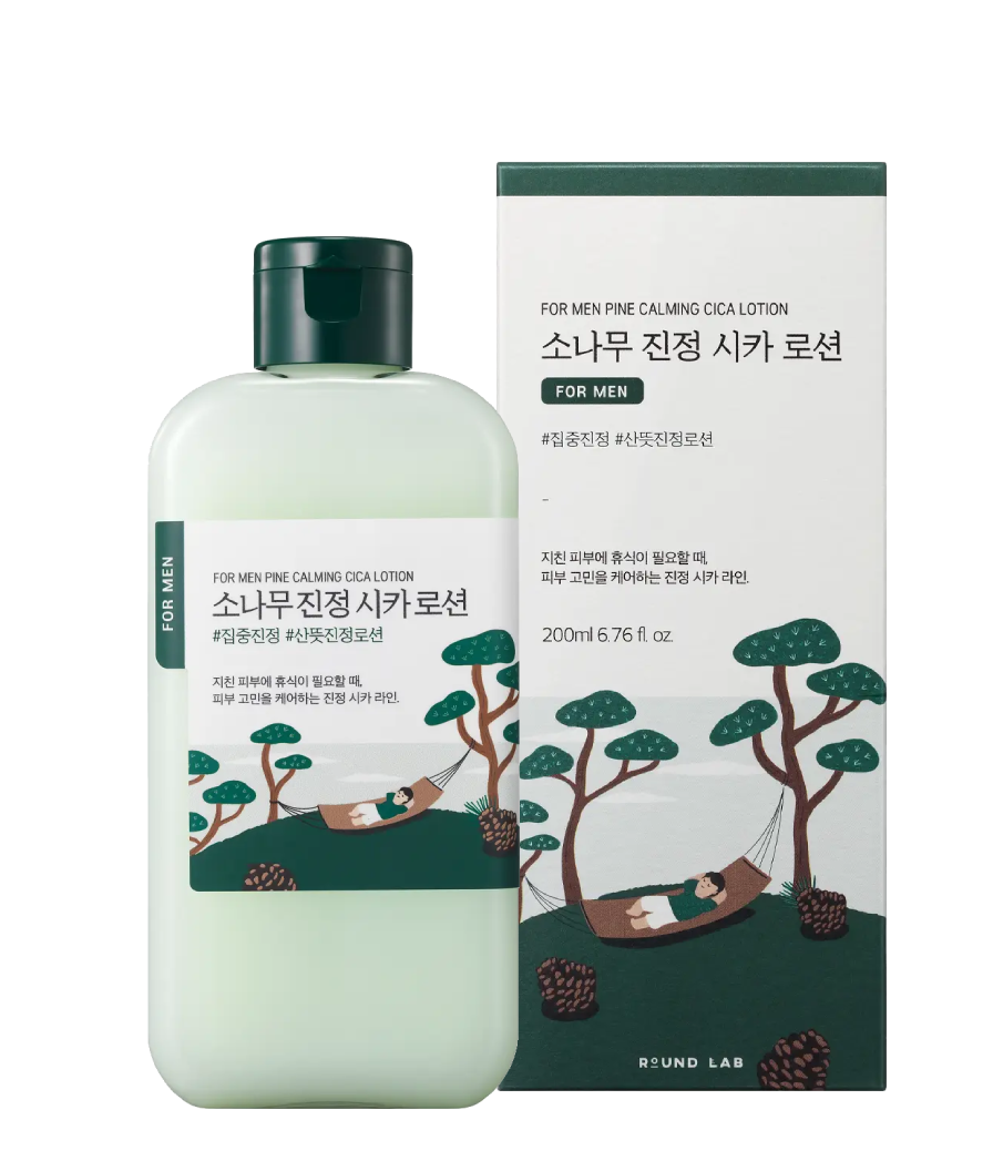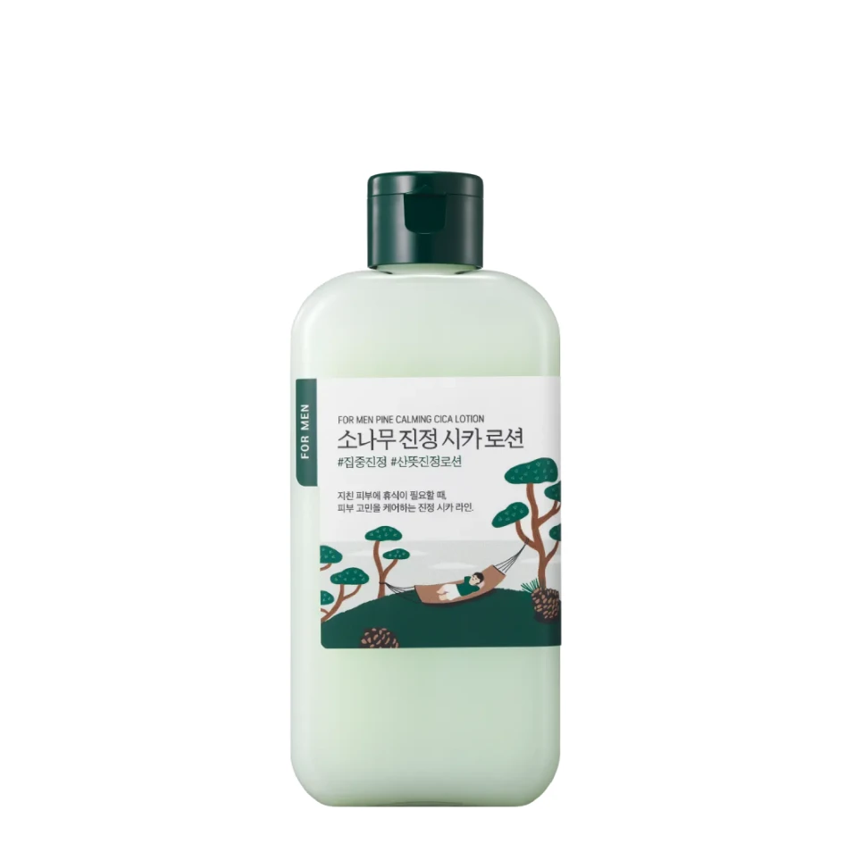 Успокаивающий лосьон для мужчин ROUND LAB For Men Pine Calming Cica Lotion устраняет раздражение и покраснения, в том числе после бритья, успокаивает чувствительную и склонную к воспалениям кожу.