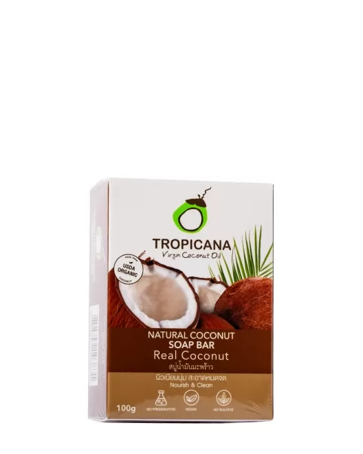 Кусковое мыло из натуральных ингредиентов TROPICANA Natural Coconut Soap Bar Real Coconut на основе кокосового масла холодного отжима бережно и эффективно очищает кожу, увлажняет и смягчает, питает, придает гладкость.