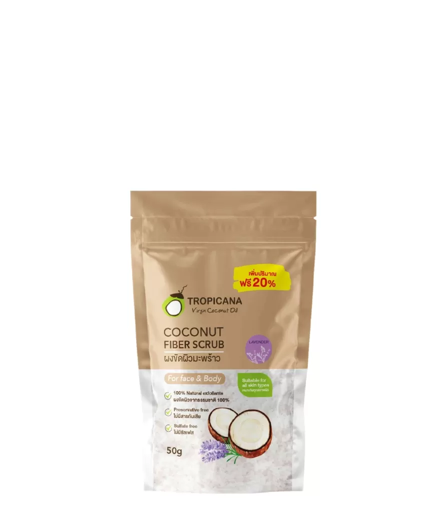 Скраб из натурального кокосового порошка ТROPICANA Coconut Fiber Scrub обогащен морской солью и эфирным маслом лаванды, обладает нежной текстурой, деликатно обновляет кожу, отшелушивая ороговевший слой клеток и очищая поры. Скраб оказывает смягчающее, антиоксидантное и противовоспалительное действие, обладает антибактериальной активностью, способствует устранению раздражений, шелушений. Тонизирует и обеспечивает коже нежной, но эффективный пилинг, выравнивает тон кожи, омолаживает и подтягивает кожные покровы. Он нормализует работу сальных желез, сужает расширенные поры и матирует кожу. Скраб активизирует обмен веществ, стимулирует микроциркуляцию.