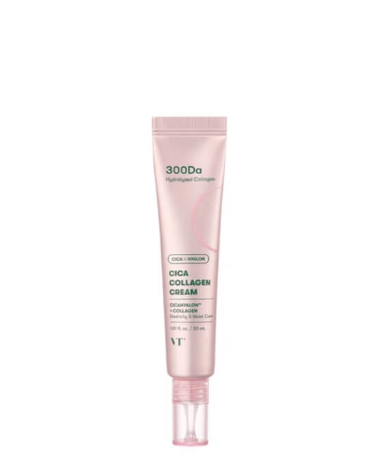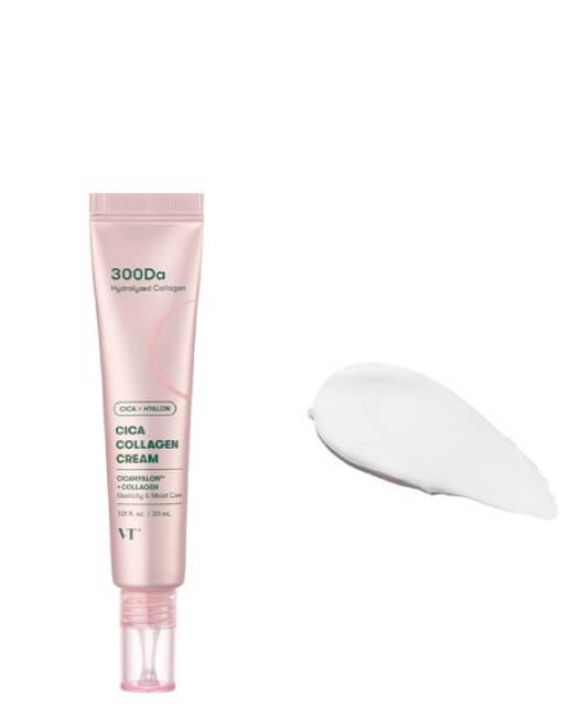 Омолаживающий крем для лица VT COSMETICS Cica Collagen Cream на основе легкоусвояемого рыбьего коллагена и витамина А эффективно омолаживает кожу, разглаживает и уменьшает глубину и ширину морщин, интенсивно успокаивает и увлажняет. Крем выравнивает тон кожи, придает сияние, устраняет тусклый цвет лица, обеспечивает пролонгированное увлажнение. Средство устраняет дряблость, подтягивает кожу, повышает упругость и эластичность.Замедляет старение кожи, стимулирует выработку коллагена, смягчает. Крем способствует сужению пор, мягко осветляет, стимулирует процессы регенерации и обновления. Оказывает антиоксидантный эффект и придает коже гладкость, питает, восстанавливает и сохраняет защитный барьер, устраняет покраснение и раздражение на коже. Далтон (DA) – это единица измерения молекулы массы белка. Чем меньше число, тем меньше размер молекулы, тем глубже она может проникнуть в кожу. В продукте используется низкомолекулярный рыбный коллаген 300 DA.Подходит сухой, нормальной и комбинированной коже. -