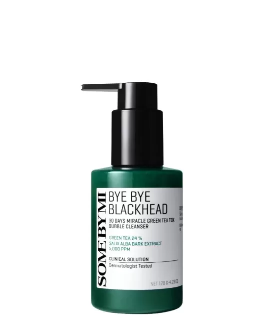 Produsul de curățare oxigenat împotriva petelor negre SOME BY MI Bye Bye Blackhead 30 Days Miracle Bubble Cleanser pe bază de arbore de ceai pătrunde adânc în pori, eliminând impuritățile și dizolvând dopurile uleioase, reduce producția de sebum și îngustează porii. Matifică fără a usca pielea; uniformizează tonul și relieful pielii, elimină punctele negre și previne apariția comedoanelor închise cu utilizare constantă.