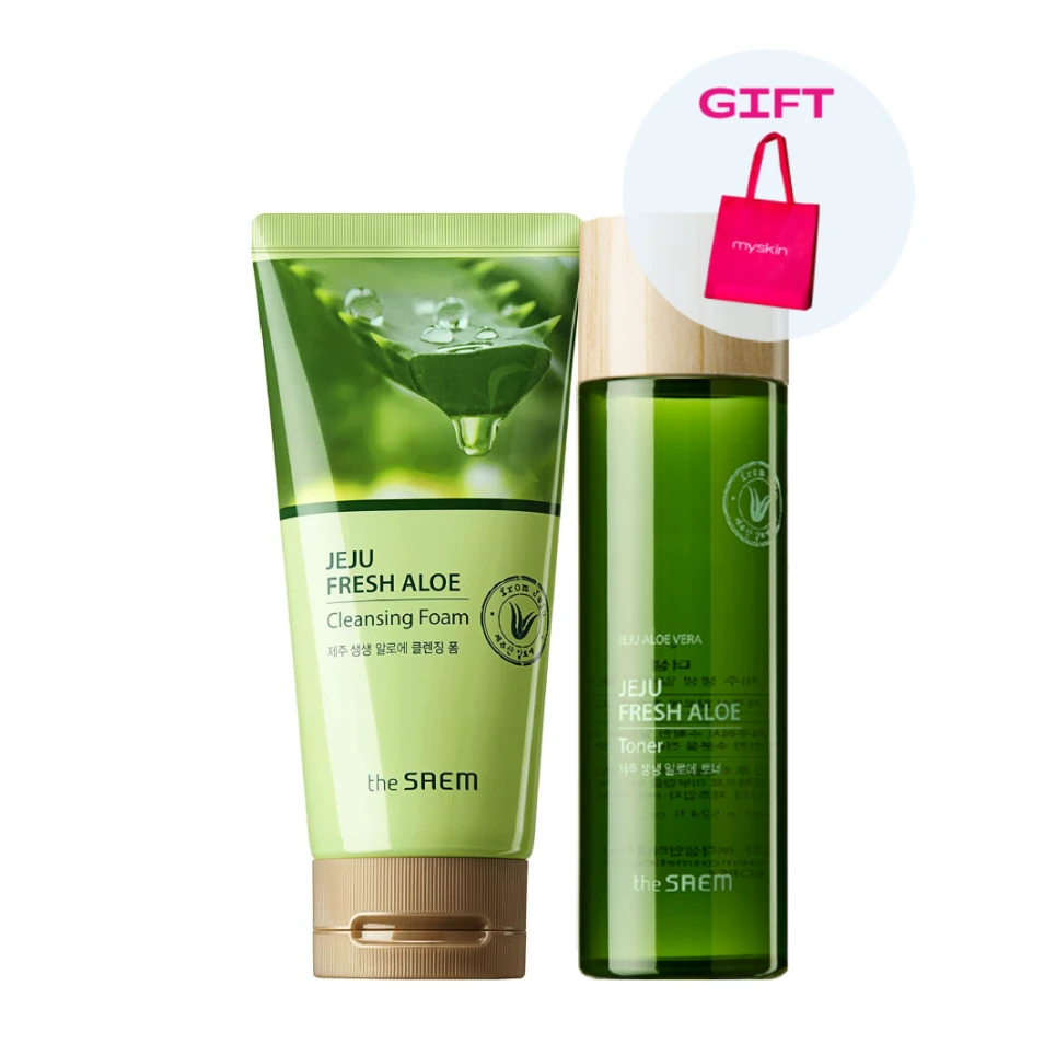 - the SAEM Jeju Fresh Aloe Toner – toner hidratant cu textură lejeră și conținut ridicat de aloe completează rapid deficitul de umiditate, elimină uscăciunea și reglează excesul de sebum, calmând eficient iritațiile. Produsul uniformizează vizibil nuanța tenului, netezește ridurile cauzate de deshidratare și stimulează regenerarea, oferind pielii o senzație plăcută de răcoare și prospețime.