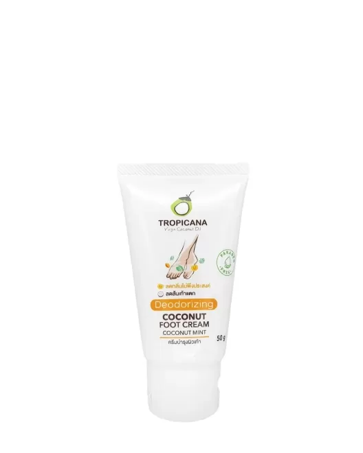 Crema deodorantă pentru picioare TROPICANA Deodorizing Coconut Foot Cream este o cremă hrănitoare, catifelantă, protectoare și hidratantă pentru pielea uscată, aspră sau crăpată a picioarelor, pe bază de ulei de nucă de cocos și parfumată cu nucă de cocos și mentă. Crema combate mirosul neplăcut, are un efect hidratant de lungă durată, prevenind apariția calusurilor și a crăpăturilor. Crema calmează, redă moliciunea și elasticitatea pielii, favorizează vindecarea și regenerarea acesteia. Are o textură bogată, care este absorbită rapid și îmbunătățește starea pielii picioarelor, oferind o senzație de confort. Fără parabeni, silicon, ulei mineral, nu este testat pe animale, formulă vegană.