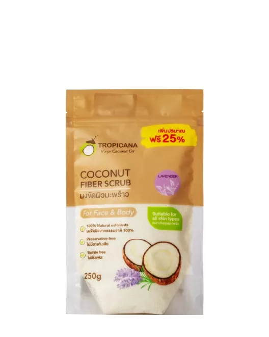 Exfoliantul natural cu pudră de nucă de cocos ТROPICANA Coconut Fiber Scrub îmbogățit cu sare de mare și ulei esențial de lavandă, are o textură delicată, reînnoiește delicat pielea, exfoliind stratul keratinizat de celule și curățând porii. Scrub-ul are un efect de catifelare, antioxidant și antiinflamator, are activitate antibacteriană, ajută la eliminarea iritațiilor și a descuamării. Tonifică și oferă pielii o exfoliere blândă, dar eficientă, uniformizează tonul pielii, întinerește și redefinește pielea. Normalizează activitatea glandelor sebacee, îngustează porii dilatați și matifiază pielea. Exfoliantul activează metabolismul și stimulează microcirculația.