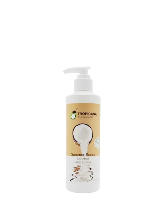 Loțiunea de corp nutritivă TROPICANA Summer Sense Coconut Skin Lotion pe bază de ulei de cocos, cu o textură ușoară, rapid absorbită, hrănește și hidratează intens pielea, elimină uscăciunea și descuamarea, menține bariera protectoare a pielii, regenerează, îmbunătățește tonusul și culoarea pielii, favorizează vindecarea, crește elasticitatea și fermitatea, netezește și catifelează. Are un parfum acvatic răcoritor. Fără parabeni, silicon, ulei mineral, nu este testat pe animale, formulă vegană.