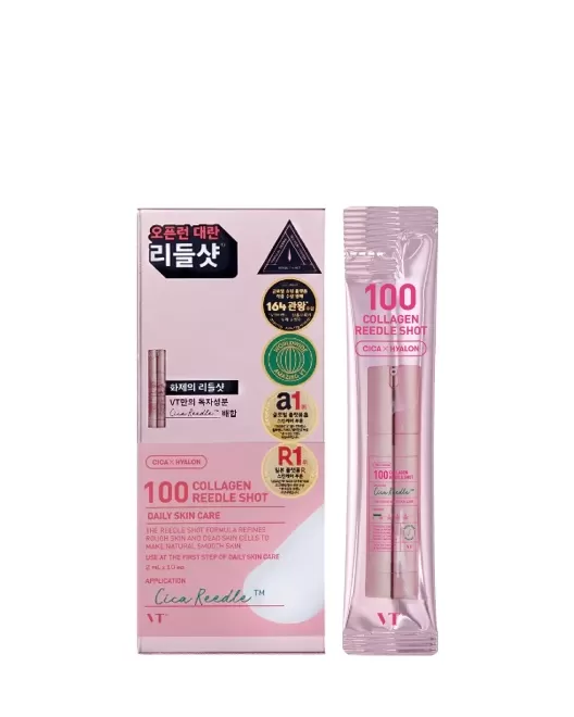 Produsul extrem de concentrat în fiolă VT COSMETICS Collagen Reedle Shot 100 poate fi utilizat zilnic, dar nu utilizați în același timp cu Reedle Shot 300 și 700.