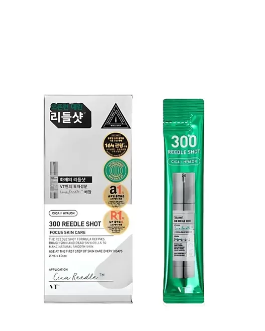 Intensificatorul de îngrijire VT COSMETICS Cica Reedle Shot 300 este formulat pentru a maximiza hidratarea, a calma pielea, a îngusta porii și a îmbunătăți textura pielii. Produsul se bazează pe tehnologia inovatoare Cica Reedle™, care imită microneedling-ul pielii pentru a furniza ingrediente active cu greutate moleculară mică în profunzimea pielii.
